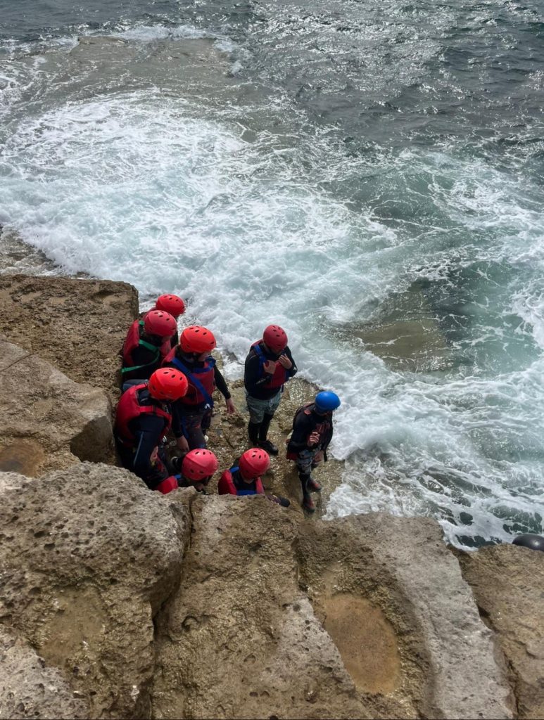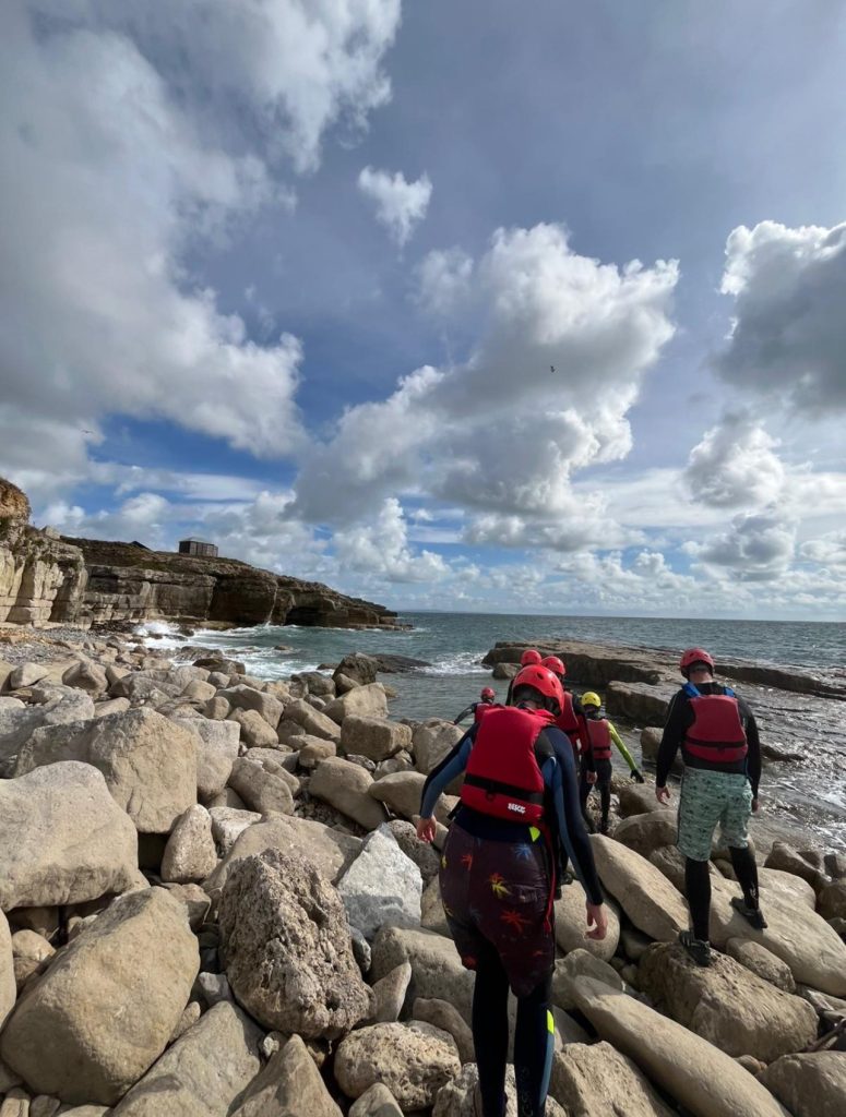 Day two was spent at Portland Bill, where apprentices took on coasteering in testing conditions. The swell was at upper limit for the session, but with careful briefing and strong teamwork the group managed tidal pools, water jumps and exposed traverses.